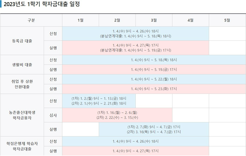 자세한 2023학년도 1학기 학자금대출 일정은 아래를 참고해 주시기 바랍니다.