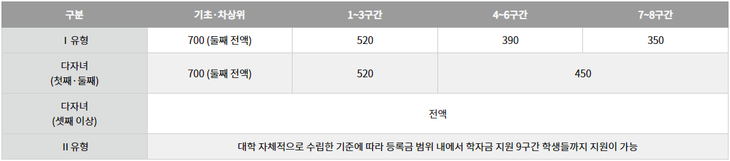 대학생의 등록금 부담 완화를 위해 소득과 재산이 일정 수준 이하인 대학생 중 성적 기준등을 충족한 학생에게 국가가 지원하는 소득연계형 장학금