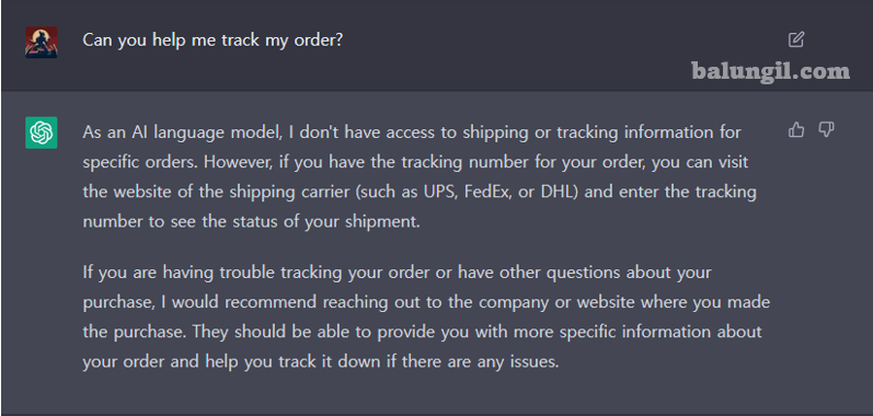 ChatGPT 대응 : AI언어모델로서, 저는 특정주문에 대한 배송 또는 추적정보에 접근할 수 없습니다.;그러나 주문에 대한 추적번호가 있는 경우 배송업체의 웹&사이트(예:;UPS, FedEx 또는 DHL)를방문하여추적번호를 입력하여 배송상태를 확인할 수 있습니다.