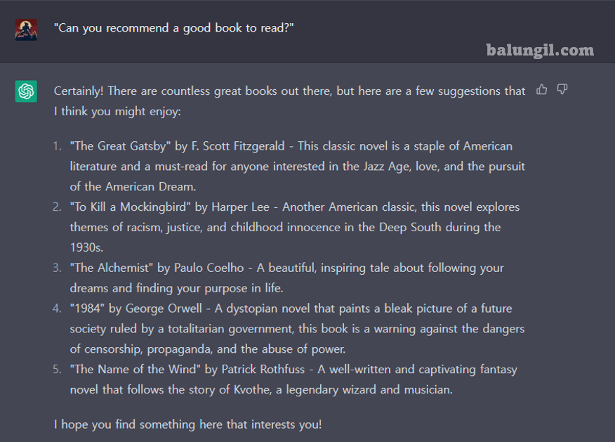 ChatGPT 답변 : 당연하죠! 세상에는 수많은 훌륭한 책들이 있지만, 여러분이 즐길 수 있는 몇 가지 제안이 있습니다