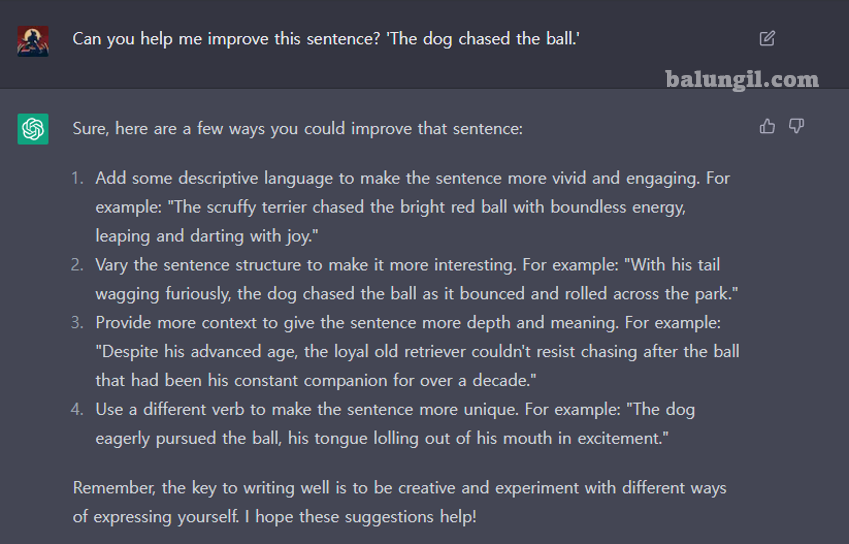 ChatGPT를 사용하여 문장 구조, 단어 선택 또는 어조에 대한 제안을 생성하여 글쓰기를 향상할 수 있습니다.