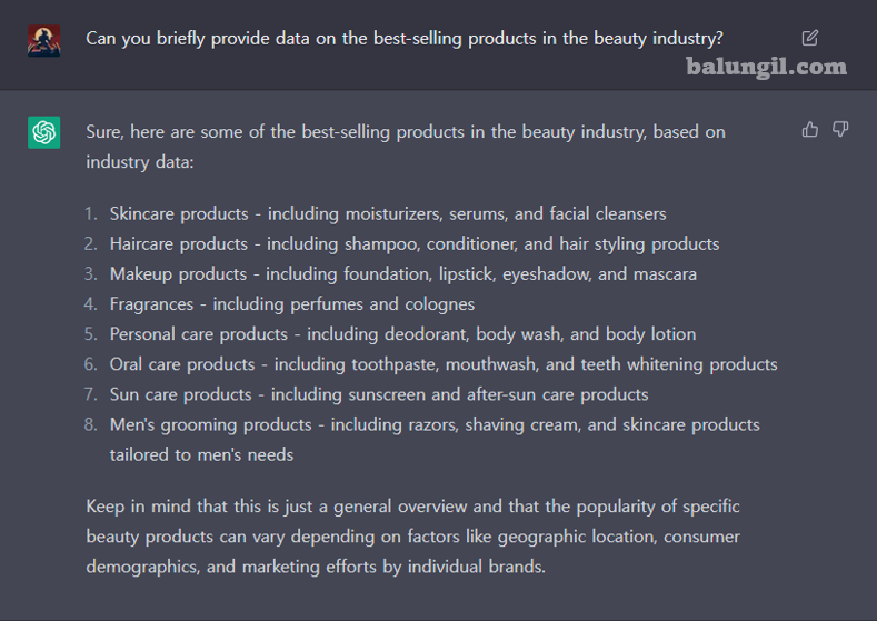 ChatGPT 답변 : 물론입니다. 다음은 업계데이터를 기반으로 한 뷰티업계에서 가장 잘 팔리는 제품들입니다: