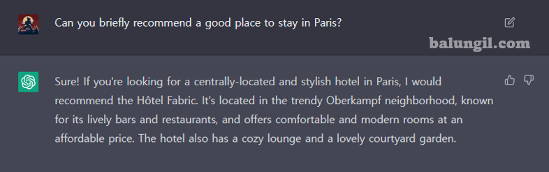ChatGPT 답변 : 그럼요! 파리 중앙에 위치한 스타일리시한 호텔을 찾으신다면 호텔패브릭을 추천해 드립니다. 활기찬 바와 레스토랑으로 유명한 트렌디한 오버캄프 & 동네에 위치하고 있으며 편안하고 모던한 객실을 저렴한 가격에 제공합니다. 호텔에는 아늑 한라 운지와 멋진 정원이 있습니다.
