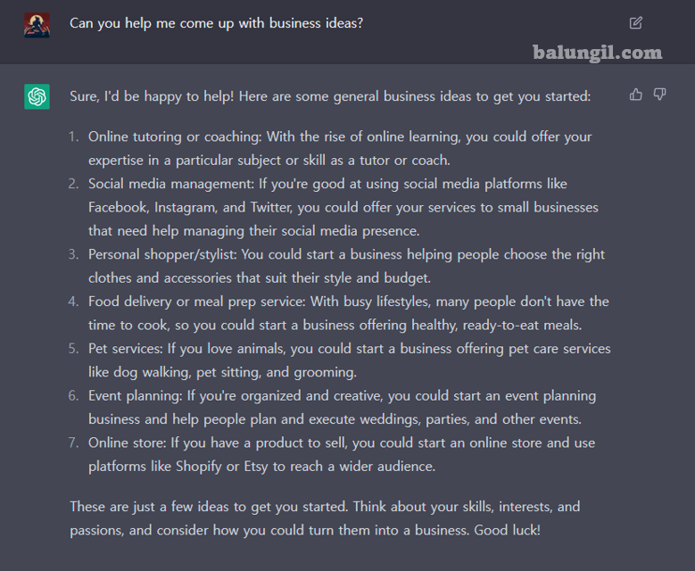 ChatGPT 답변 : 물론이죠, 기꺼이 도와드리죠! 시작하기 위한 몇 가지 일반적인 비즈니스 아이디어는 다음과 같습니다:
